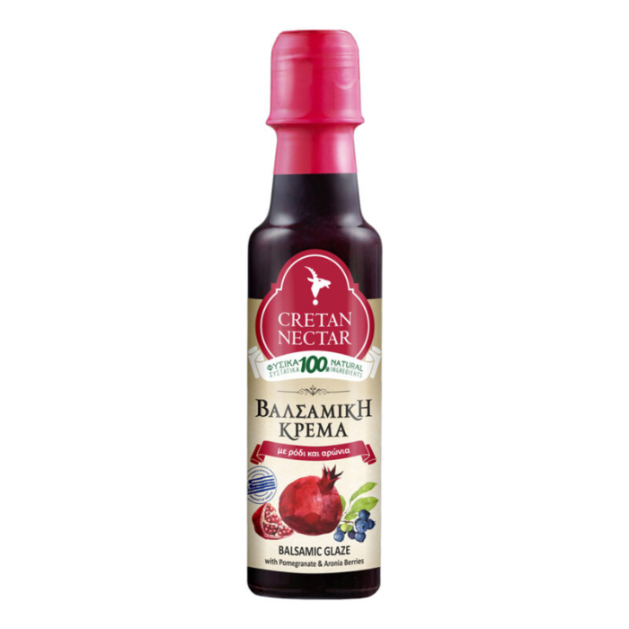Τρία ιδιαίτερα υπέρ-φρούτα, η αρώνια, το ρόδι και το σταφύλι, ενώνουν τα αρώματα, τις γεύσεις αλλά και τις ευεργετικές τους ιδιότητες, δημιουργώντας ένα μοναδικό άρτυμα χωρίς την προσθήκη ζάχαρης, χρωστικών και συντηρητικών. Η Βαλσαμική Κρέμα με Ρόδι και Αρώνια Cretan Nectar ταιριάζει ιδανικά σε ψητό κρέας, ποικιλίες τυριών, φρουτοσαλάτες και γιαούρτι.